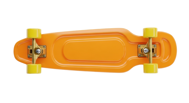 Isolated yellow skateboard or cruiserboard viewed from above, ready for action and adventure