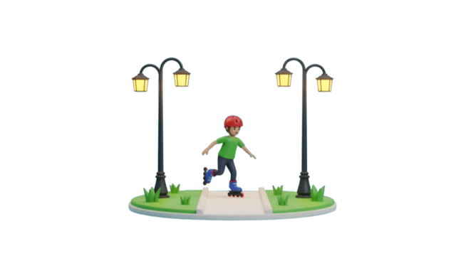 Cartoon boy rollerblading in a park with lampposts