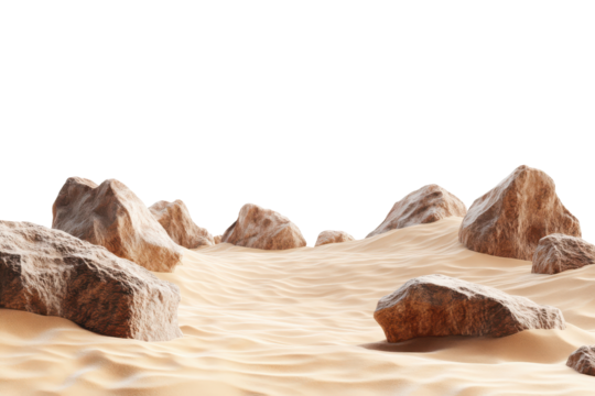 Lush green grass covers rolling hills dotted with large stones under a bright sky isolated on transparent background