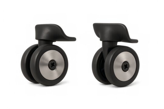 Hardshell suitcase with smooth rolling wheels isolated on white transparent background