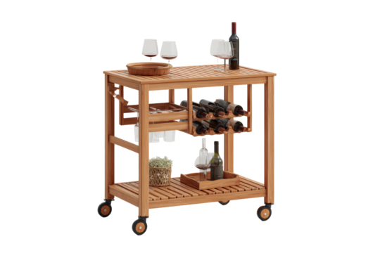 Wooden kitchen trolley bar cart on wheels with wine rack and glasses.