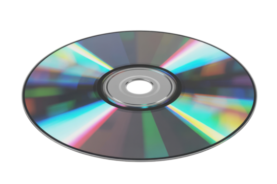 Iridescent compact disc gleaming with rainbow spectrum, highlighting digital media against transparent backdrop