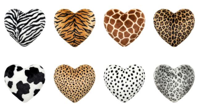 Heart shaped plush pillow set including zebra, tiger, giraffe, leopard, cow, cheetah, and dalmatian animal prints. Safari theme decor collection.