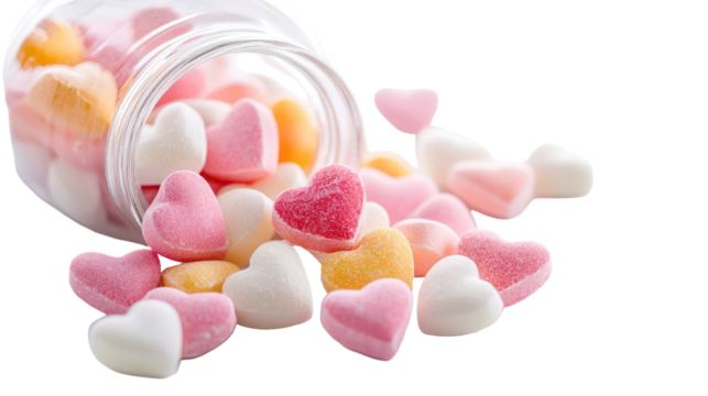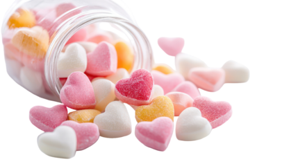 Colorful valentine's heart candies spilled from jar, sweet treats, love concept, isolated on transparent background