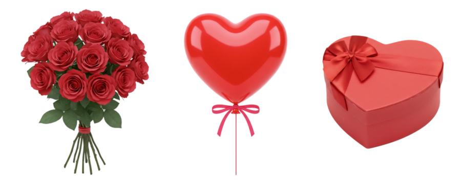 An assortment of romantic Valentine's Day gifts, featuring a bouquet of red roses, a heart-shaped balloon, and a heart-shaped gift box. This collection is perfect for a grand gesture of love.