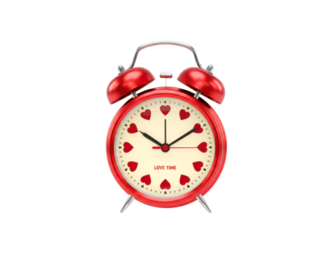 Red vintage style alarm clock with a cream dial featuring heart shapes instead of numbers and the romantic text 'Love Time' printed on its face in a close-up view