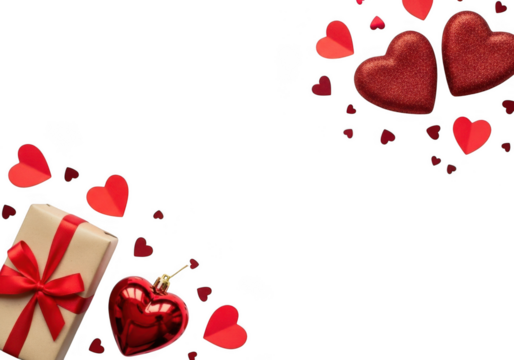 Gift box with red ribbon and heart ornaments surrounded by red paper hearts isolated on transparent background, symbolizing love and romance for valentines day