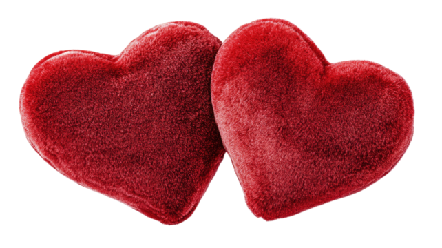 Two red velvet hearts with soft textured surface and vivid romantic shape displayed in detailed view isolated on white background