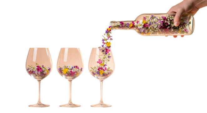 Whisking elegance and nature, vibrant wildflowers pour from a bottle into glasses, creating a delicate floral infusion. This unique visual blends beauty and sophisticated charm