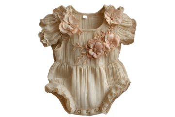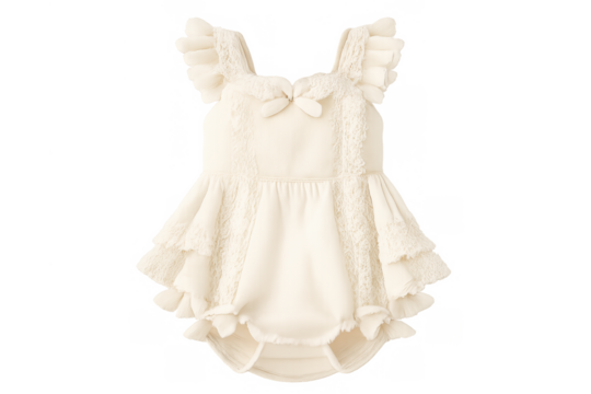 Adorable baby romper in cream color featuring ruffles, lace texture, and a delicate bow detail, for fashion and clothing concepts