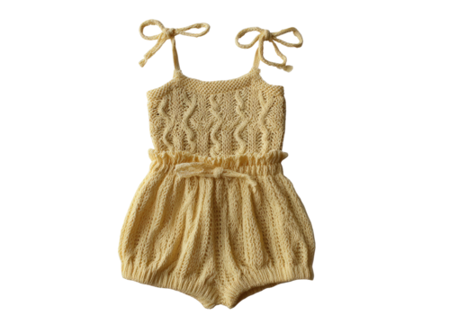 Creamy knit baby romper with shoulder tie straps; ruffled waist, soft fabric