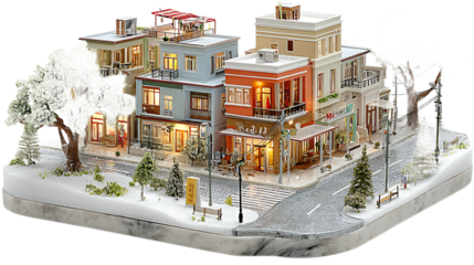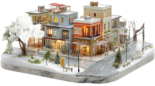 Miniature Winter Cityscape with Illuminated Buildings and Snow