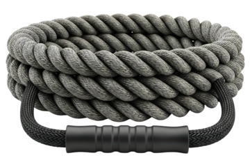 Coiled gray heavy battle rope with grips for gym workouts isolated on a transparent background