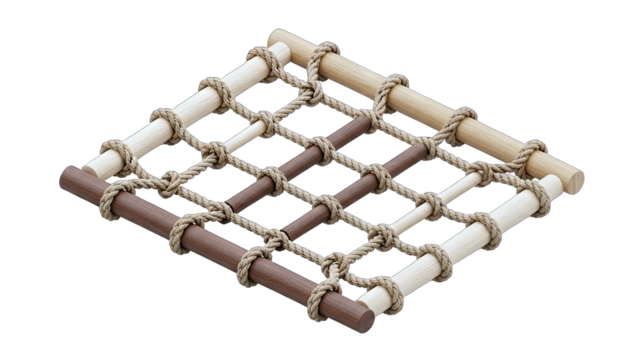 Close up of a nautical rope ladder made of thick rope and wooden poles, seen from a low angle looking up against a bright sky, suggesting adventure and exploration.