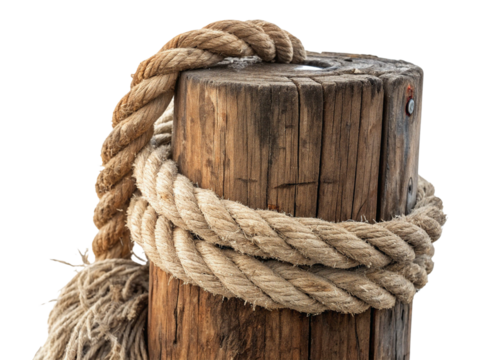 Detailed close-up of a rustic, natural hemp rope fishing net against a clean white backdrop, perfect for nautical themes and textures