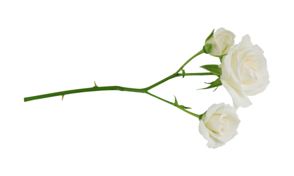 A delicate branch of white roses with buds and green leaves isolated on transparent background