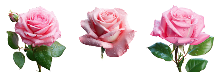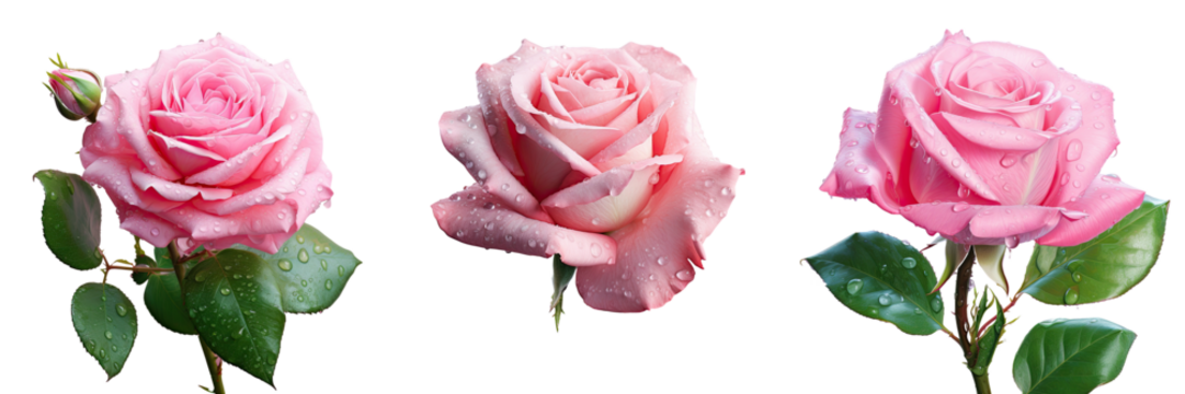 Pink rose with green leaves raindrops on transparent background