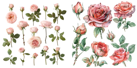 A collection of flowers. Sketches of blossoms with stalks and leaves. transparent, isolated set of different florets. A bush of wild roses. A spring yellow bloom twig. Watercolor painting. PNG File