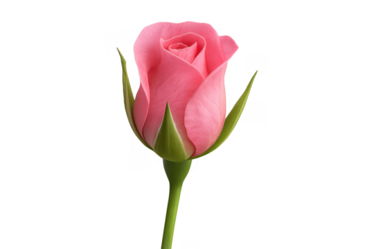 Single fresh red rosebud with green sepals, isolated on white and transparent