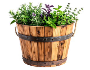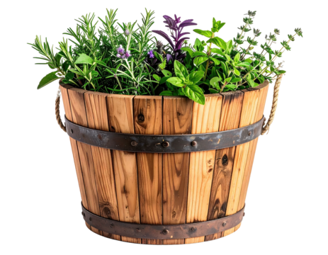 Wooden bucket overflowing with an assortment of vibrant, fresh, green herbs