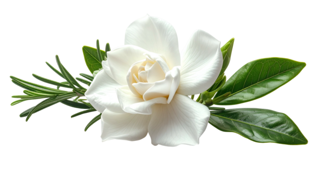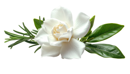 A pristine white gardenia bloom framed by green rosemary and leaves, isolated on black
