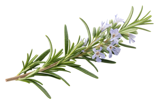 Fresh rosemary sprig with delicate white flowers isolated on transparent background
