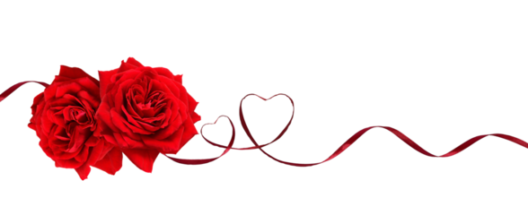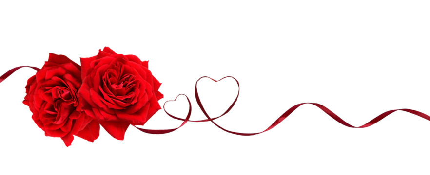 Red rose flowers in a line arrangement with satin ribbon hearts isolated on white or transparent background for Valentine Day.