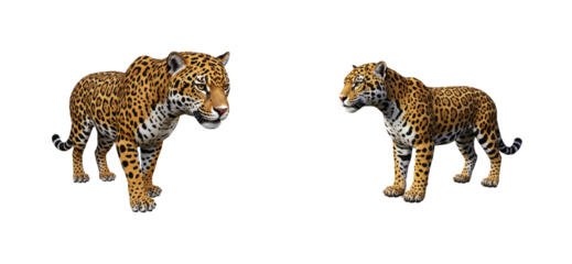 Two beautiful spotted jaguars stand alert, a powerful pair of wild cats with intense gazes and detailed rosette patterned fur, representing strength and the wild
