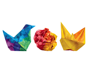 Three colorful paper creations.  Rainbow-hued origami birds, one a crumpled paper rosette in the center