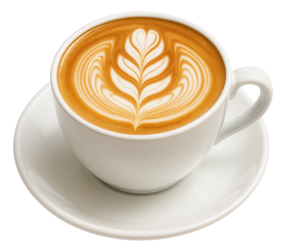 Flat white topped with intricate rosette latte art in a white porcelain cup on a saucer.