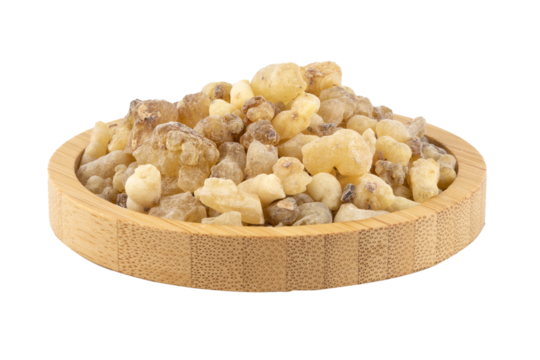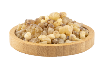Myrrh Resin and Plant: Aromatic amber myrrh resin pieces, accompanied by dark myrrh berries and fresh green sprigs.