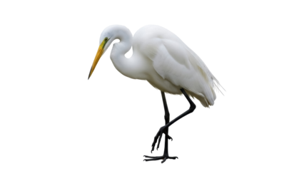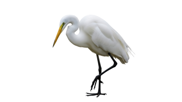 Elegant great egret PNG isolated on transparent background, graceful white heron with yellow beak standing tall for design projects