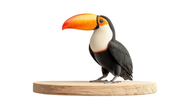 A vibrant toucan with a bright orange beak and white chest stands on a wooden base, provided as a PNG on transparent background
