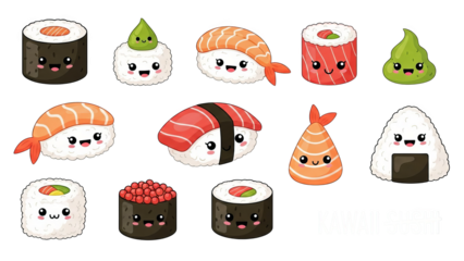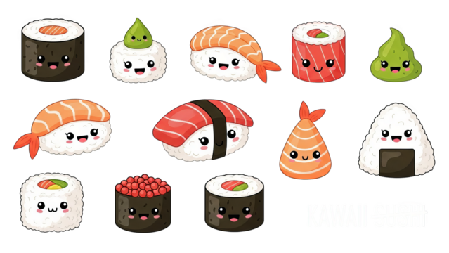 Kawaii Sushi Collection With Cute Cartoon Japanese Food Icons