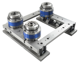 Four-station precision clamping system.  A square-shaped, metal machine base supports fou