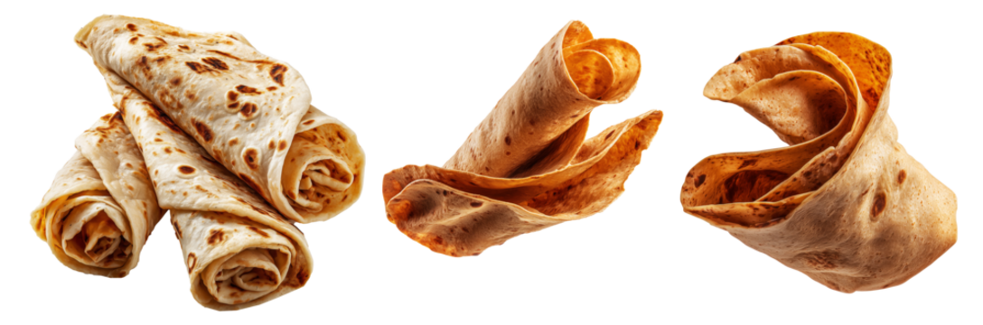 Set of tortillas or roti wraps, isolated on white background, concept of traditional food