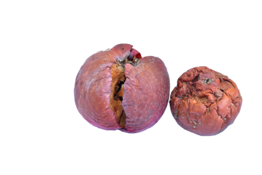 rotten apple fruit isolated on white. side view rotten apple on a white background