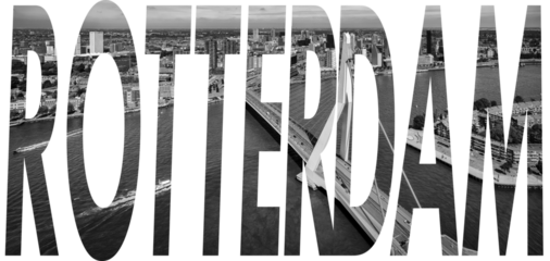 Letters Rotterdam a city in the Netherlands, black and white text with the erasmus bridge in the background