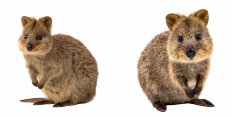 Two quokkas standing side by side against a black background in a studio setting view