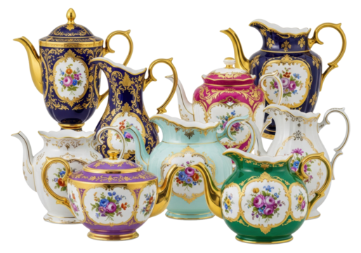 stylized grouping of antique european porcelain teapots and pitchers featuring ornate gold scrollwork and hand-painted floral designs, isolated on white, concept of historical opulence