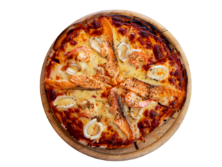 Pizza fruit de mer sans fromage vu de dessus découpée sur un support en bois rond