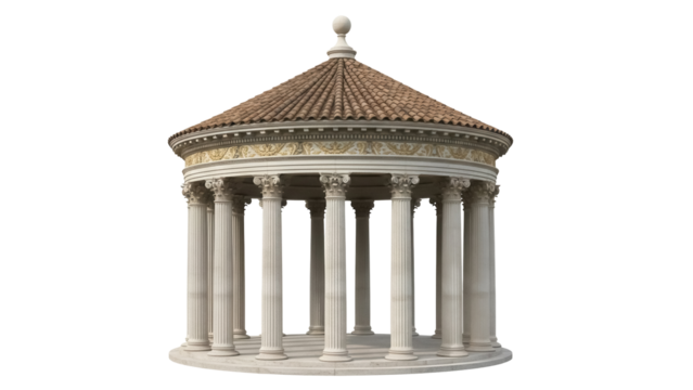 Classical rotunda isolated PNG on transparent background, architectural structure with columns and tiled roof, ancient temple building for design projects