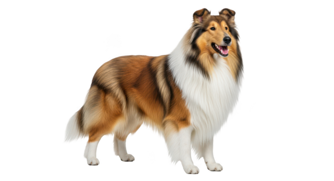 Rough Collie dog standing full body, isolated on transparent background.