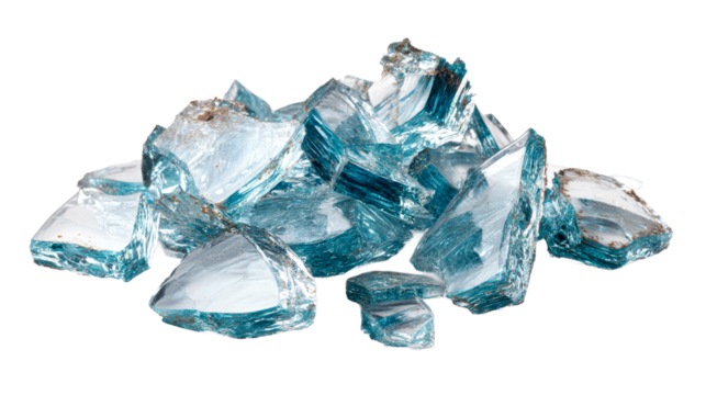 Pile of broken blue glass shards with rough edges and brown inclusions, symbolizing destruction, fragility, or a hazardous material, ideal for abstract textures or concepts of damage and