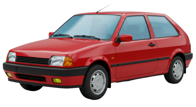 Isolated orange small hatchback, vintage car from the eighties, on light background