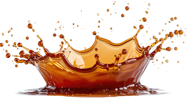 A dynamic depiction of a liquid crown, capturing the moment of splash. Brownish hues and droplets against a black backdrop