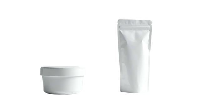 Two white, round containers, one with lid, against black
