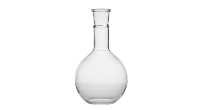 Clear liquid in a round bottom glass laboratory flask with a narrow neck isolated on a transparent background