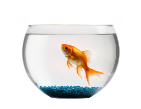 Goldfish swimming in a glass fishbowl containing clear water, isolated with a transparent background