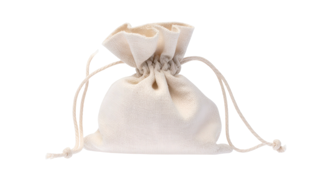 Beige drawstring pouch, tied closed, isolated on black background, soft, natural fabric
